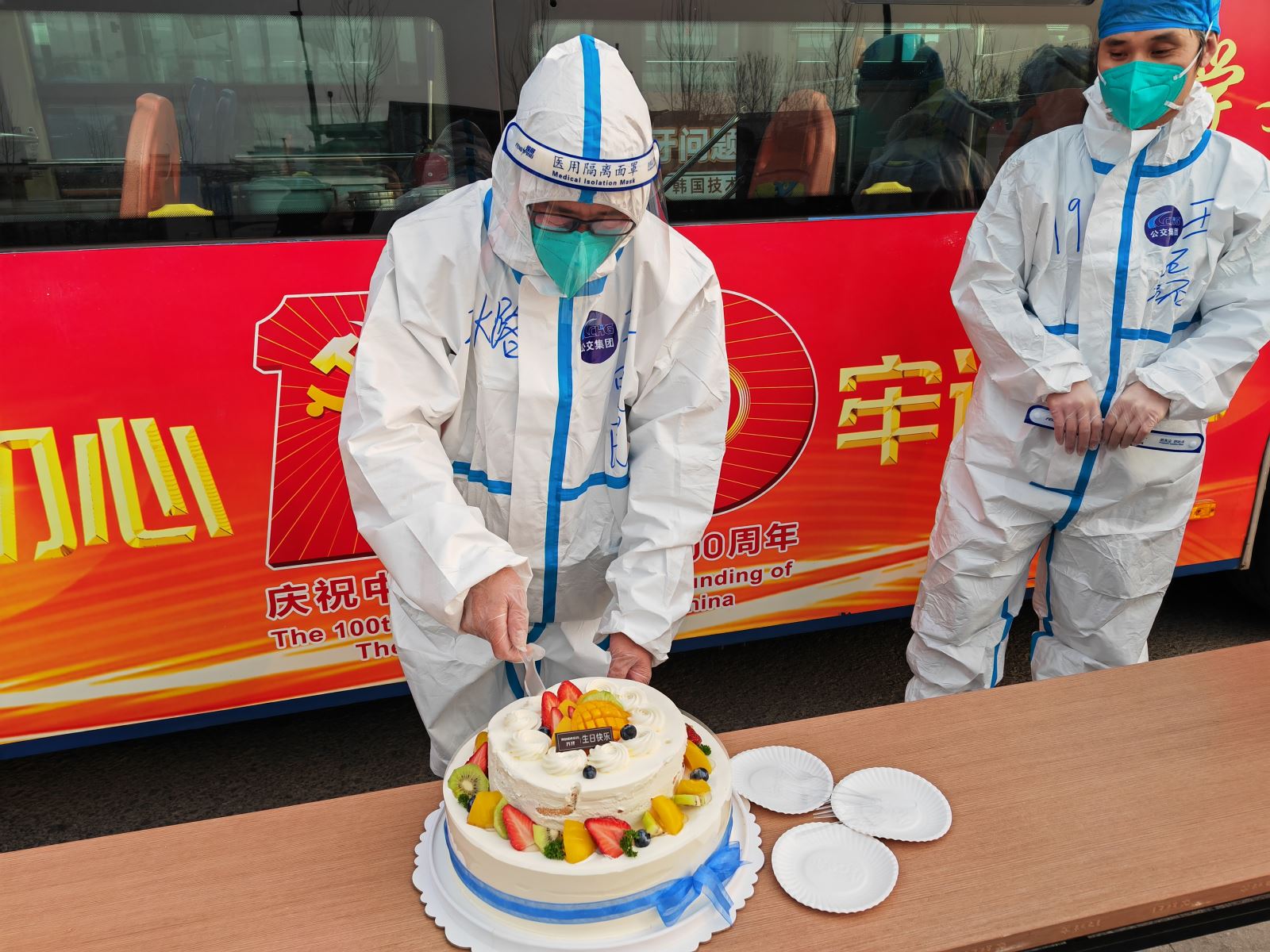 “這個月我們有四位同志過生日,因疫情工作原因,大家都堅守在抗疫一線,沒能慶祝生日,在這個特殊的時間里,今天大家一起為你們過一次’疫’線集體生日!”轉運工作組領導為他們送上了生日祝福。