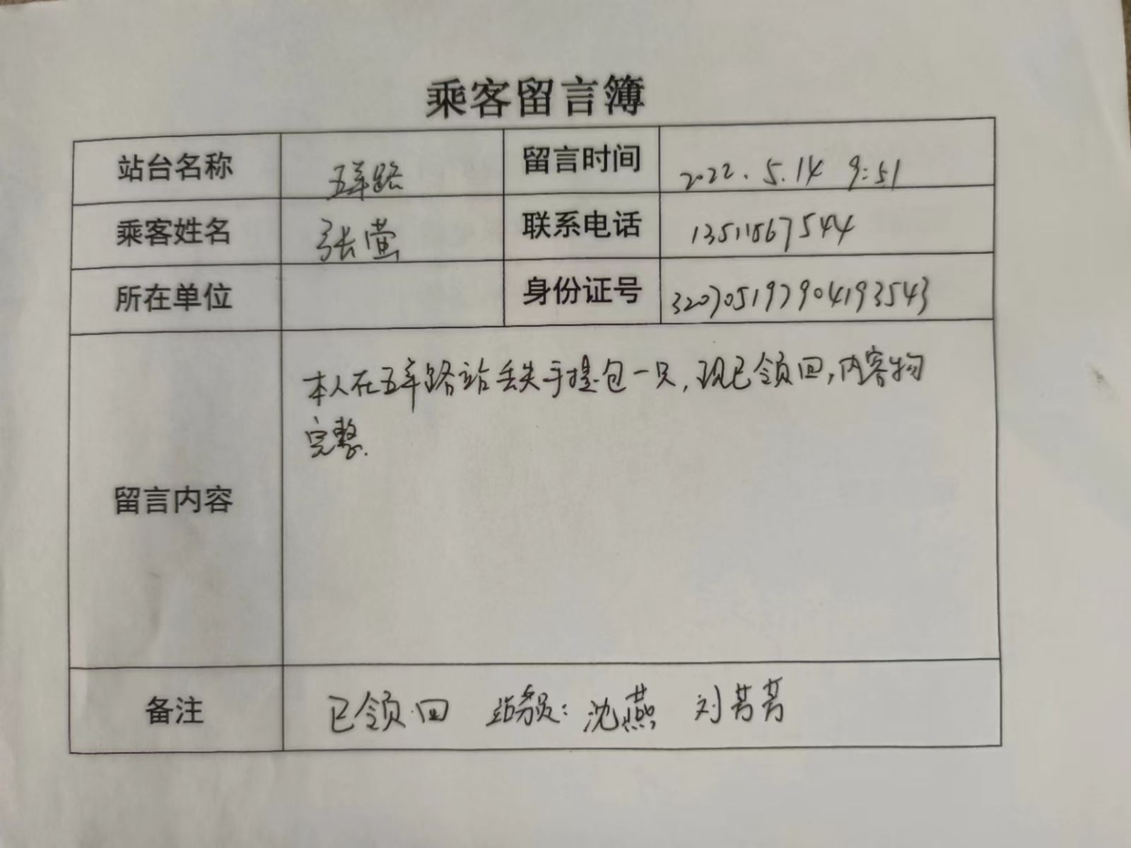 5月4日上午,新光路站當(dāng)班站務(wù)員劉芳芳正在查驗(yàn)乘客“雙碼”及測(cè)量體溫。就聽見有人在喊:“站務(wù)員,站務(wù)員!”劉芳芳便往喊聲處望去,只見一位乘客從B1車上下來邊跑邊喊,劉芳芳見狀急忙迎了上去并詢問發(fā)生了什么事情:原來是乘客上車太匆忙,車輛出站后發(fā)現(xiàn)自己的包丟在了五羊路站臺(tái)。在問清丟失包的特征及丟失位置后,劉芳芳立即返回票房聯(lián)系五羊路站站務(wù)員。在等待回復(fù)的時(shí)間,劉芳芳安撫乘客著急的心情,幾分鐘后,得到五羊路站站務(wù)員的回復(fù)說:“包找到了,讓乘客盡快來領(lǐng)取。”劉芳芳將這一消息告訴乘客,乘客連連表示非常感謝。又過了一會(huì),五羊路站務(wù)員告知?jiǎng)⒎挤?,失物乘客已領(lǐng)回并留下感謝信。