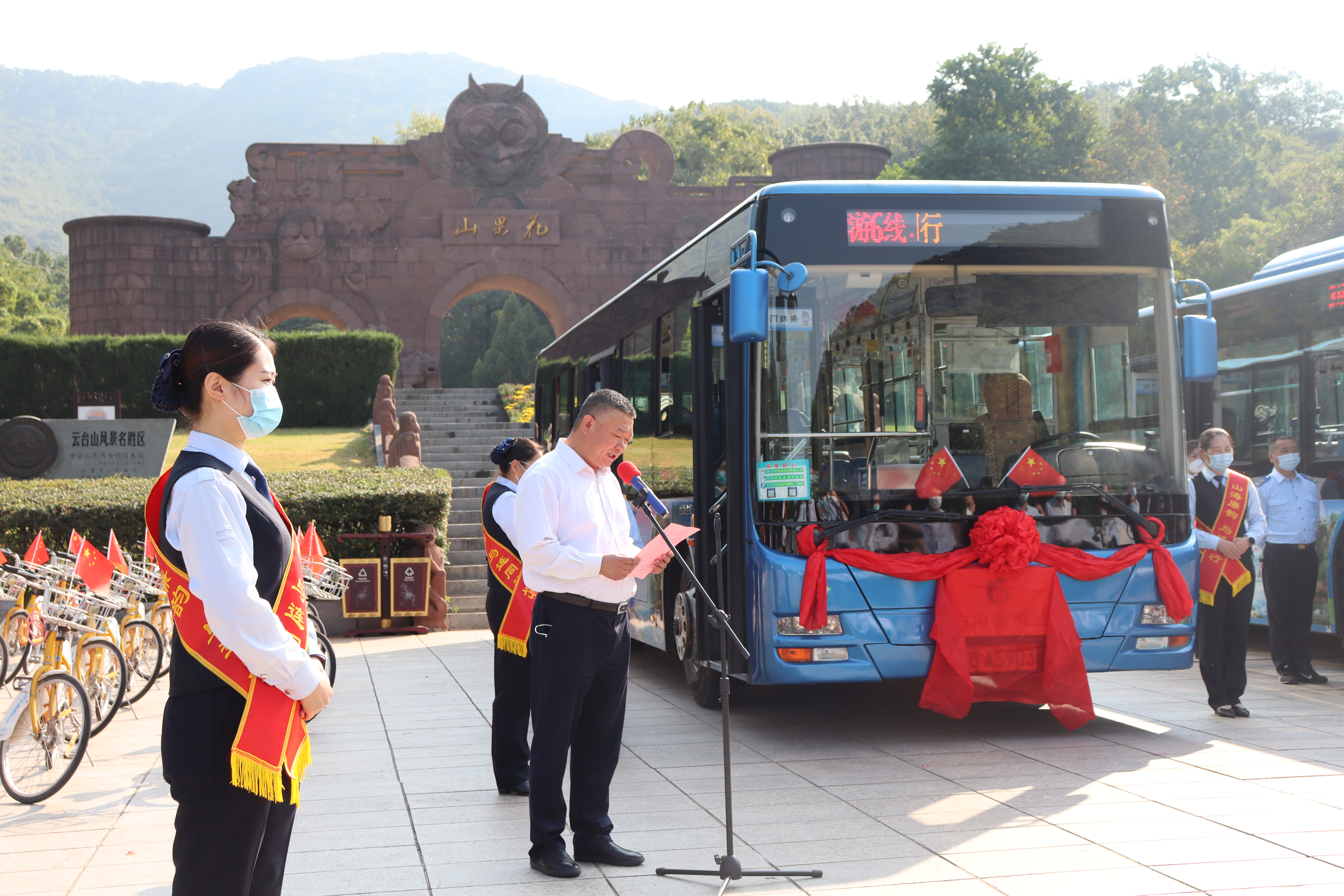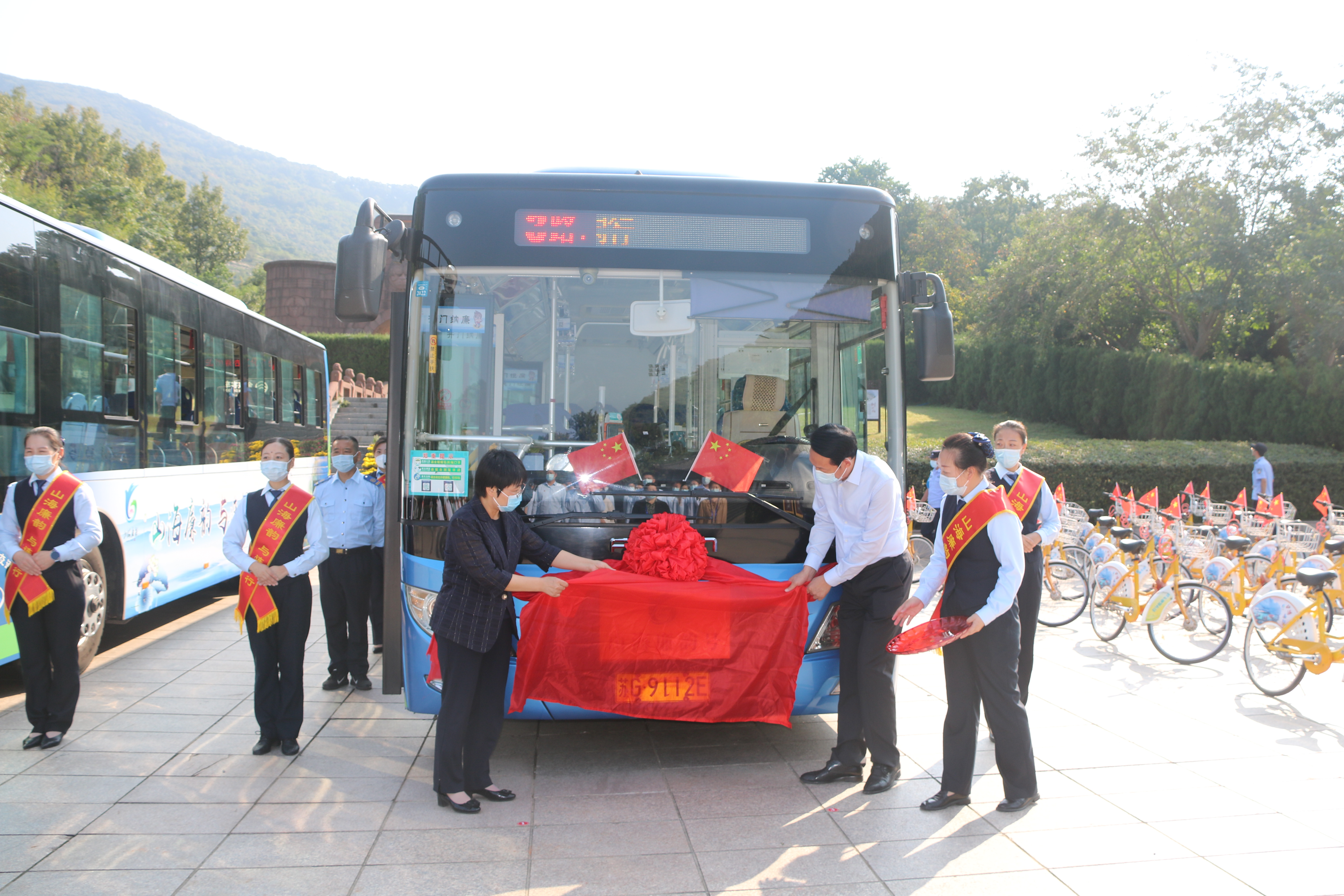 啟動儀式現(xiàn)場,在統(tǒng)一的鳴笛后,3路、游6路兩臺“山海廉韻號”廉潔示范車以花果山山門為首發(fā)站,載著黨員干部代表前往參觀星海湖清廉園等紀法教育基地,沿途還參觀了市政府公交站的廉潔公益廣告等。