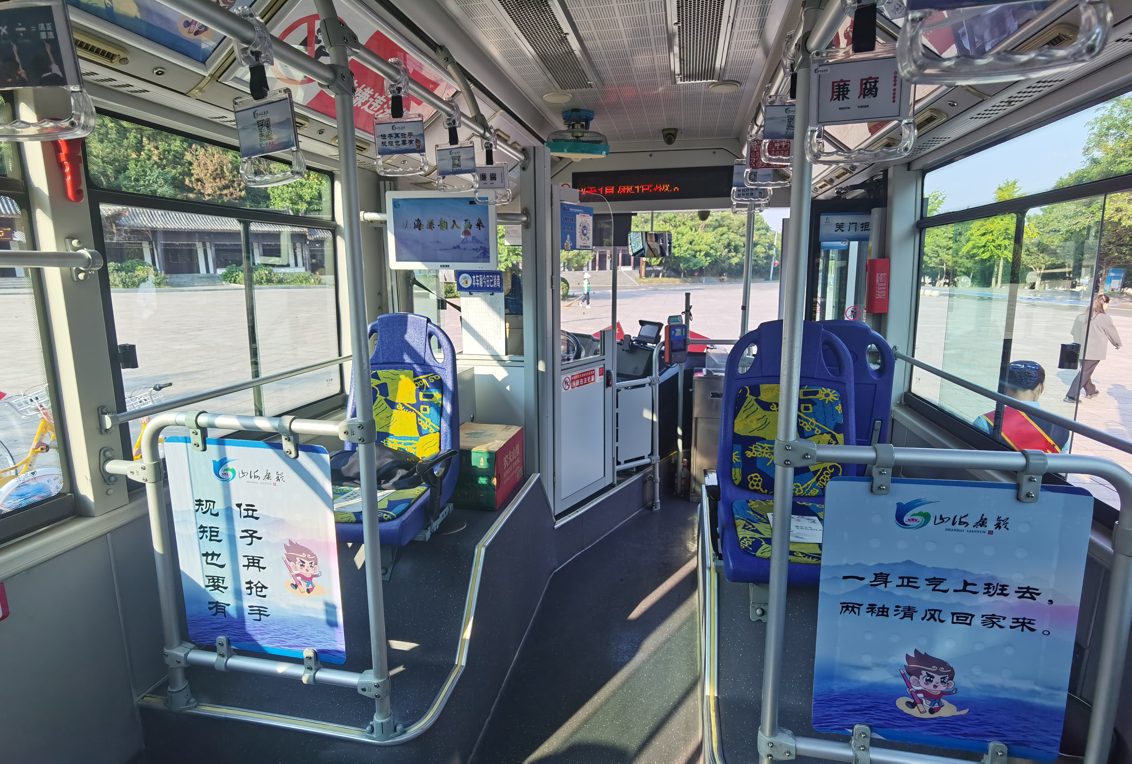 近年來,公交集團充分發(fā)揮公交行業(yè)特色優(yōu)勢,在2018年首批廉潔文化示范車15、19路的基礎(chǔ)上,以“山海廉韻 與連同行”廉潔文化品牌為指引,不斷加強廉潔文化平臺建設,創(chuàng)新廉潔文化載體,新增了3路、游6路廉潔文化示范車,并選取了市政府站、龍河廣場站等10個公交站臺,將“山海廉韻 與連同行”主題廉潔公益廣告、漫畫等融入站臺線路標識,形成了以公交車、公交站為窗口的立體化廉潔文化宣傳平臺。車內(nèi)及線路標識上看似普通的一條條廉語、一幅幅漫畫,像春風化雨般深入人心,不斷向社會傳播清風“廉”能量,使港城獨具特色的“山海廉韻 與連同行”廉潔文化進一步得以推廣。