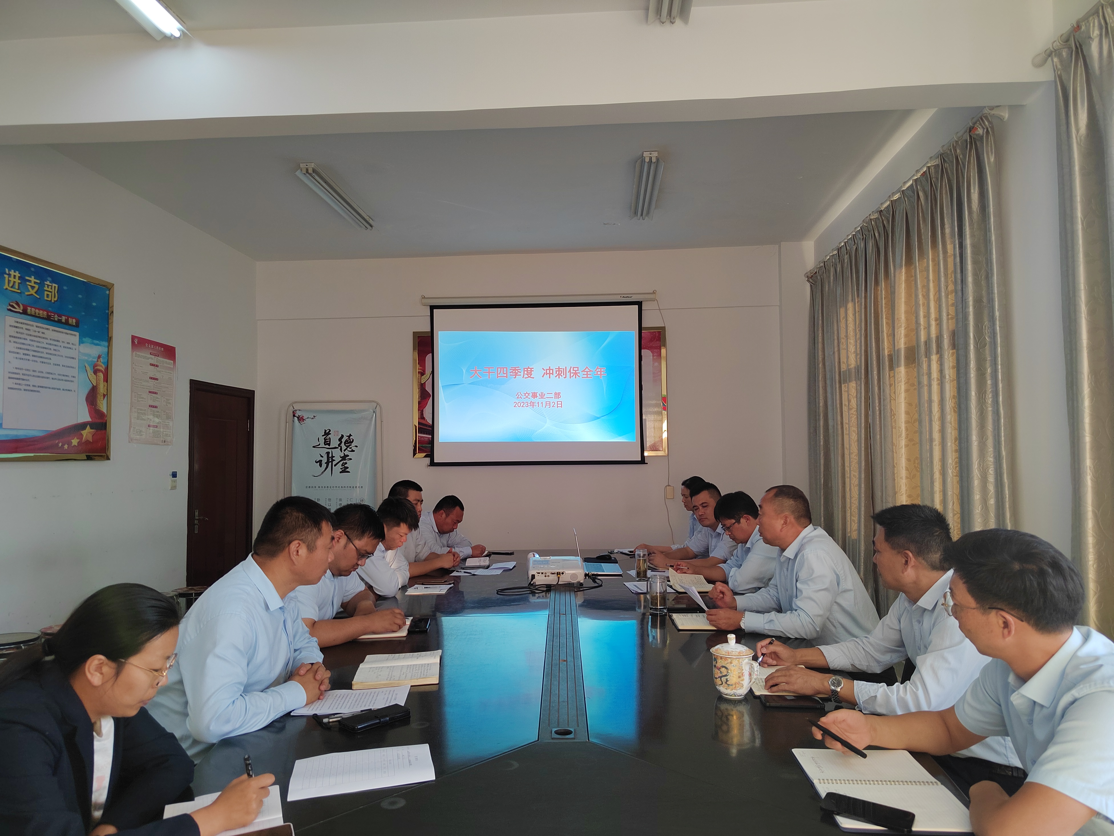 會(huì)議最后,公交事業(yè)二部支部書(shū)記、經(jīng)理莊劉柱強(qiáng)調(diào),大家要提高思想認(rèn)識(shí),改進(jìn)工作作風(fēng),提高工作效率,相互協(xié)作,向著“大干四季度,沖刺保全年”的目標(biāo)任務(wù)奮勇邁進(jìn)。
