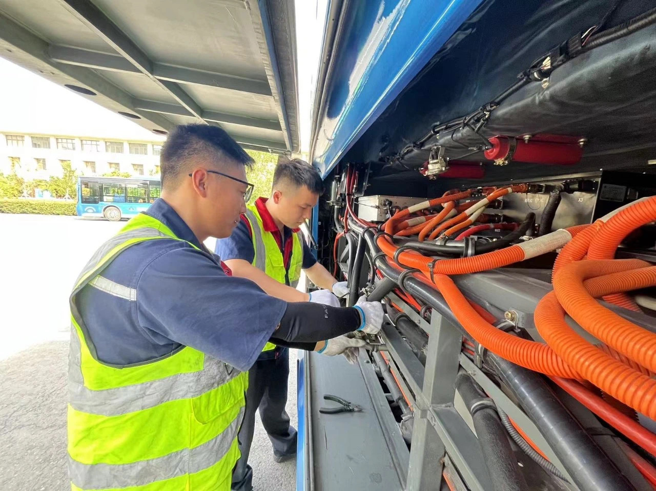 在公交車統(tǒng)一換成純電動車后,相較傳統(tǒng)維修技術(shù)更側(cè)重于電腦診斷,我們利用平時參加廠家培訓(xùn)和自學(xué),牢記大量的故障代碼,上路搶修體現(xiàn)的是及時響應(yīng)、快速處理,就是要在眾多電路故障代碼中要準(zhǔn)確判斷車輛故障部位,且提供快速處置的方法,這就需要日積月累的知識儲備與維修經(jīng)驗。作為90后的我們,在本職崗位上恪盡職守,無論是哪里出現(xiàn)車輛拋錨,無論車輛是哪里的故障,我們總會第一時間趕到現(xiàn)場,在無遮擋、條件不充足的情況下克服炎熱、寒冷的環(huán)境,鉆車底、爬高處,心里想的總是一件事,那就是把車修好。