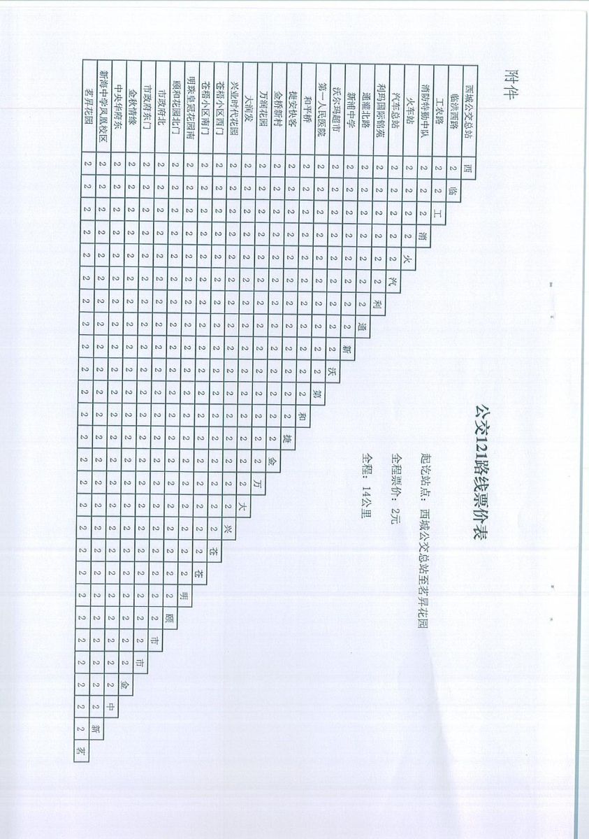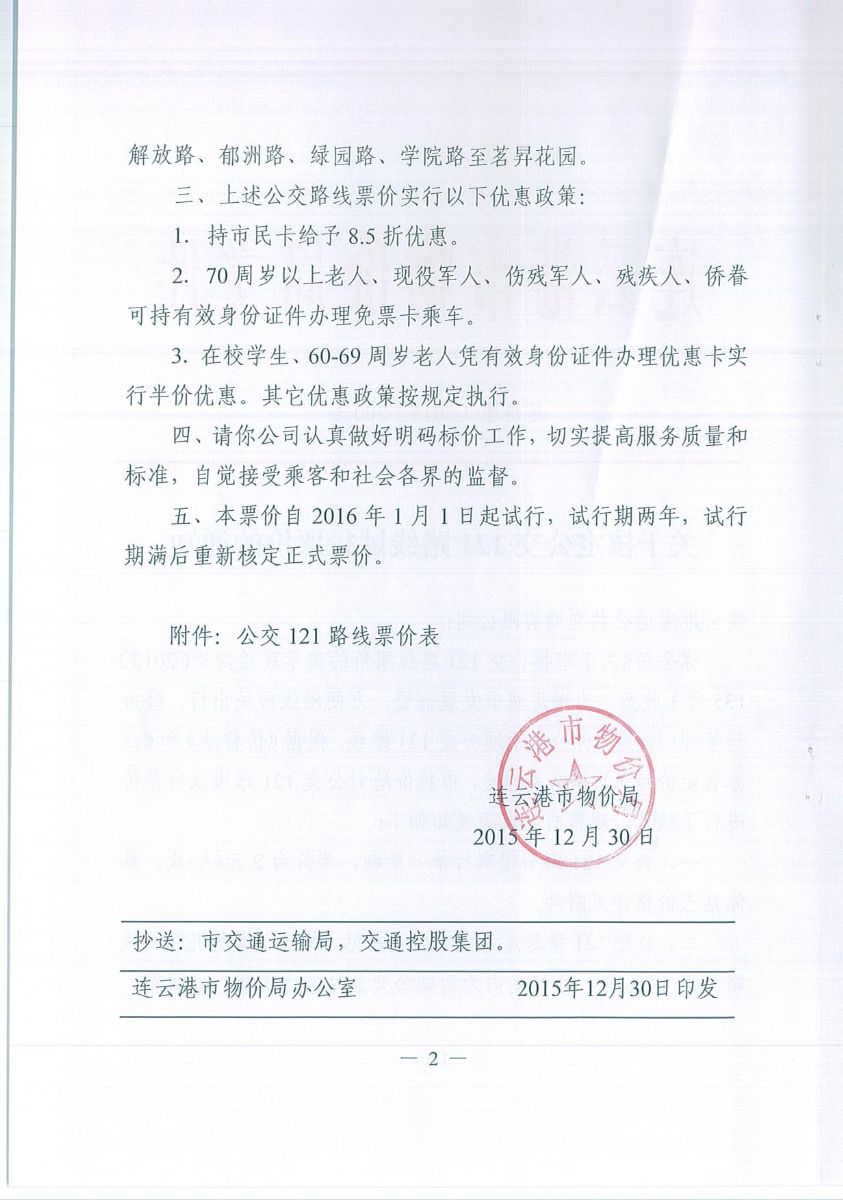 關于核定公交121路線試行票價的通知