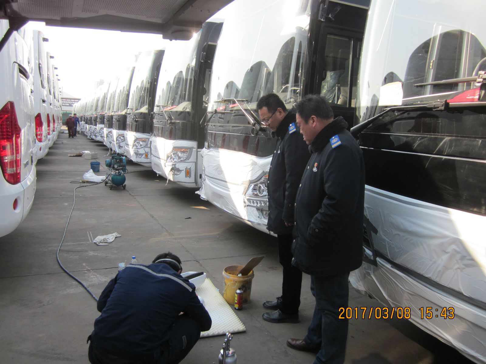 接到任務(wù)大家都感到壓力很大,因?yàn)楣恍蘩砉?、大浦廠以往一天的工作量只能完成40臺(tái)左右高檔巴士整備工作,而現(xiàn)在任務(wù)是70臺(tái)一天,于是公司領(lǐng)導(dǎo)班子立即召開(kāi)專題會(huì)議,高度重視該批車輛出口任務(wù),精心布置抽調(diào)熟悉業(yè)務(wù)的精兵強(qiáng)將20人組成突擊隊(duì)。3月8日早上5點(diǎn)鐘,一行20人的突擊隊(duì)準(zhǔn)時(shí)出發(fā)奔赴港口,中午,打來(lái)快餐在工地現(xiàn)場(chǎng)就餐,放棄午休,連班作業(yè),下午趙玉軍經(jīng)理、楊國(guó)軍書記又親臨作業(yè)現(xiàn)場(chǎng)為大家鼓勁,并作安全作業(yè)交代,在大家的共同努力下直到晚上11點(diǎn)多鐘終于完成了70臺(tái)高檔車裝船前的整備工作,此項(xiàng)任務(wù)的如期完成也受到了外商及宇通客車廠家的高度評(píng)價(jià)。