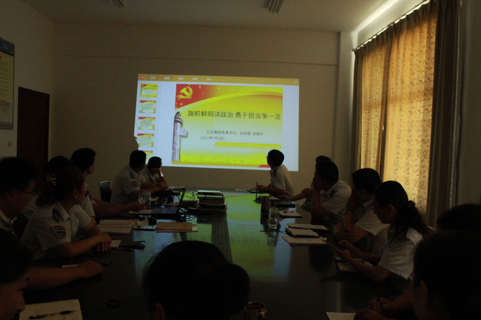 7月14日上午,公交東部公司黨支部召開“旗幟鮮明講政治”專題學(xué)習(xí),培訓(xùn)會由支部副書記寧濘主持。此次培訓(xùn)學(xué)習(xí),寧濘帶領(lǐng)大家學(xué)習(xí)公交集團黨委書記、總經(jīng)理劉佃華以《旗幟鮮明講政治 勇于擔(dān)當(dāng)爭一流》為題的專題黨課,全面貫徹落實公交集團黨委的各項工作部署和要求。最后,寧濘要求:一是黨員、干部一定要旗幟鮮明講政治,時刻注意自己的黨員形象,要為廣大職工當(dāng)表率。二是黨員、干部一定要敢擔(dān)當(dāng)、有作為,深入一線,密切聯(lián)系群眾,切實解決一線駕駛員的實際困難。三是全體員工要加強自身學(xué)習(xí),嚴(yán)格自律,干好本職工作,全力以赴做好當(dāng)前創(chuàng)文工作。