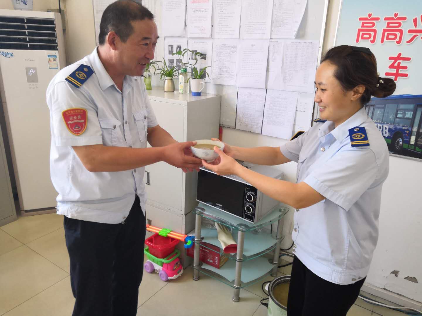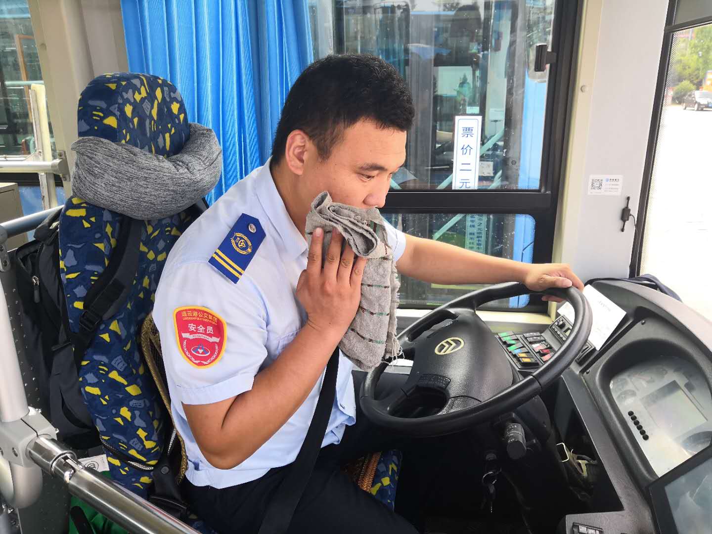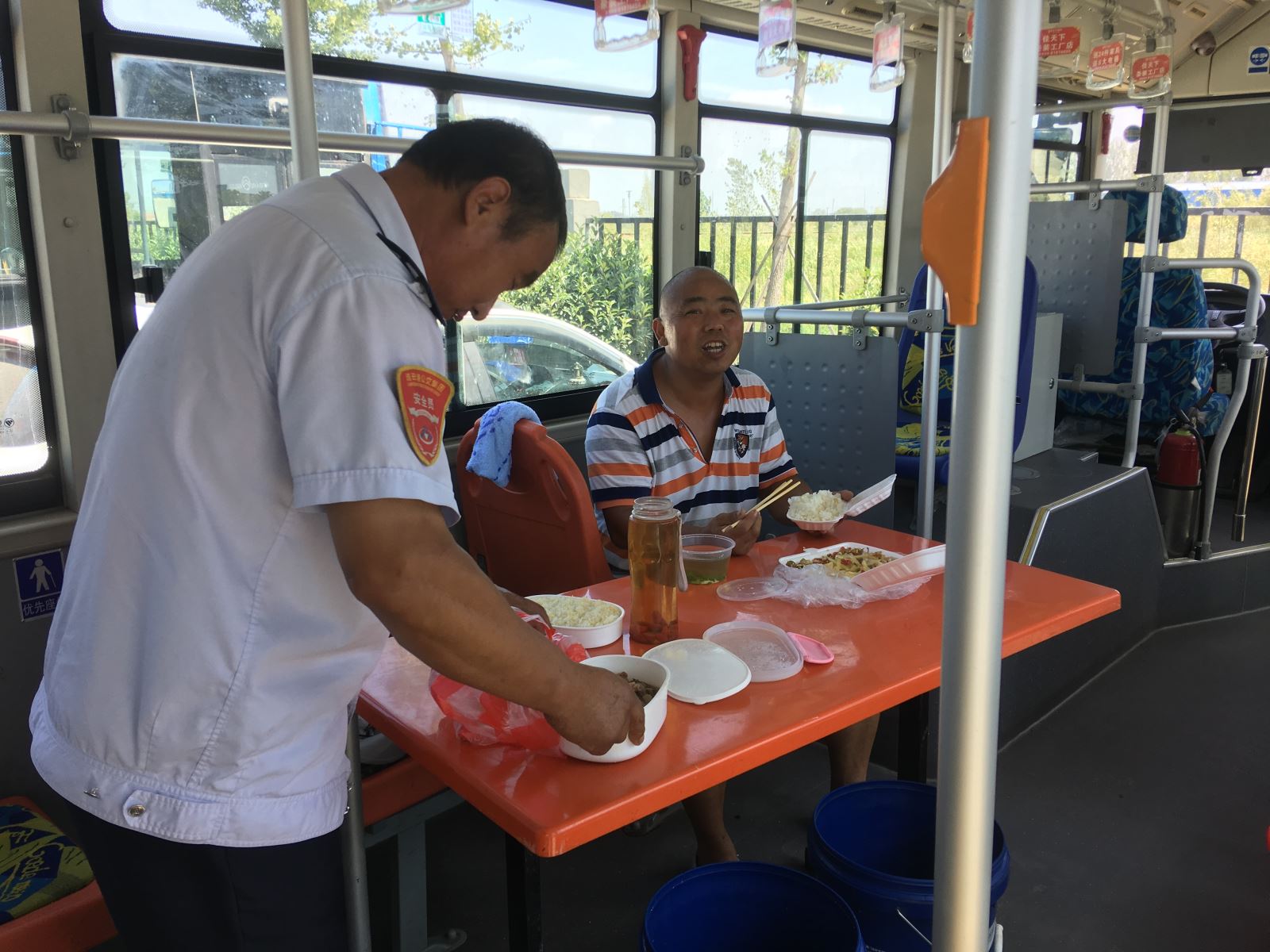 即使是在高溫天氣,為了保證市民乘客的日常出行,港城的公交人們?nèi)淌苤邷乜崾钜琅f堅守崗位,默默地揮灑著汗水。公交集團海通公交公司為切實踐行“分公司為一線駕駛員服務”的服務理念,各分公司實行輪流值班制,在線路車輛密集的西城公交停車場,上午10:30左右,公司安排一輛電動車停放場內(nèi),車上擺放了簡易餐桌和飲用水供駕駛員休息、吃飯使用。