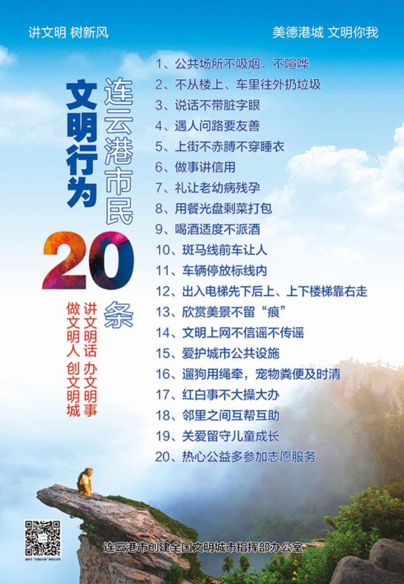 你們好!創(chuàng)建全國文明城市,提高城市文明程度,建設(shè)文明幸福、風(fēng)景優(yōu)美、高質(zhì)發(fā)展的連云港是港城人民的共同心愿。讓我們積極行動(dòng)起來,從自己做起,從具體事情做起,為港城更美好的明天出一份力。