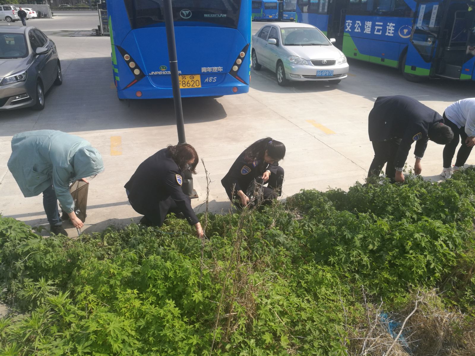 活動現(xiàn)場,公交集團經(jīng)營發(fā)展事業(yè)部的志愿者們帶著垃圾袋清理場站各處的塑料瓶、煙頭、廢紙、包裝袋等丟棄物。雜草叢生的深處較為困難,同時也充滿了蟲蠅等使得清掃工作增加了難度,但是大家都充分發(fā)揚了“不怕苦、不怕臟、不怕累”的精神,頂著烈日齊心協(xié)力打掃衛(wèi)生死角等區(qū)域,通過大家的努力,使得場站煥然一新。