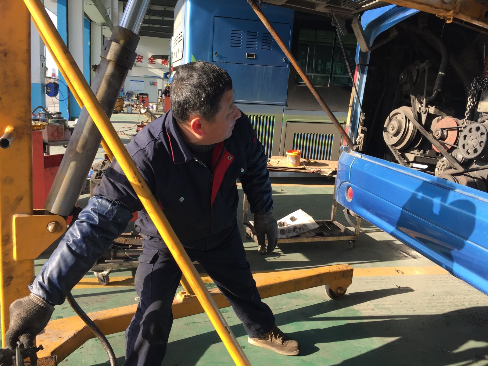 他,是默默守護(hù)公交健康的“醫(yī)生”,三伏天里,他們和公交駕駛員一起堅(jiān)守崗位,為公交順利運(yùn)營(yíng)做好后勤保障工作。新能源車輛在高溫潮濕的夏季里最容易出現(xiàn)問題,車?yán)锏目照{(diào)由于長(zhǎng)時(shí)間使用,也常常出現(xiàn)故障。下午兩點(diǎn)多,正是一天中最熱的時(shí)候,蒸籠般的熱浪如影隨形,讓人無(wú)處躲藏。而在大浦分廠維修車間內(nèi),修理工張善強(qiáng)正在公交車?yán)餀z查空調(diào)制冷故障,汗水濕透了工作服,他只是擦了擦汗又繼續(xù)開始手頭的工作。